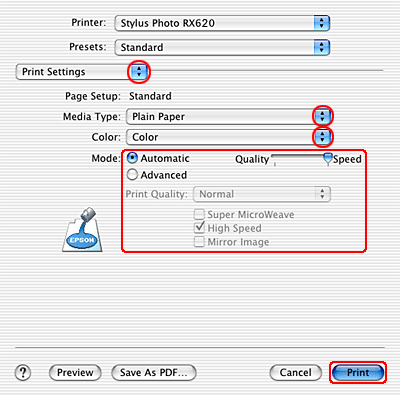 Make the appropriate Media Type, Color, and Mode settings. See online help for details of Print Settings.