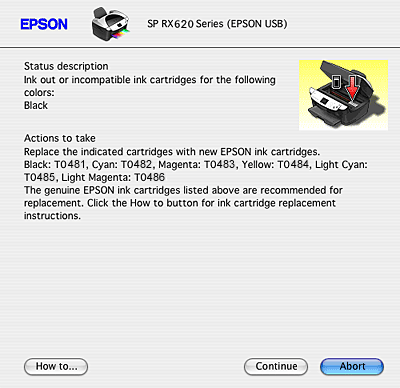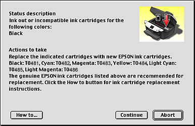 When the ink runs low or out, a How to button appears below the text box. Click How to, and EPSON Status Monitor 3 will lead you step-by-step through the cartridge replacement procedure.