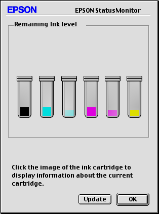 You can also use this utility to check ink levels before printing. EPSON StatusMonitor displays the amount of ink remaining at the time it was opened. To update the ink level information, click Update.