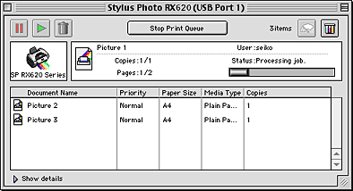 EPSON Spool Manager is similar to Windows Print Manager. If it receives two or more print jobs at one time, it holds them in the order that they were received (with printers on a network, this may be called a print queue). When a print job reaches the top of the line, EPSON Spool Manager sends the job to this product. From the spool manager, you can view print status information about the print jobs that have been sent to this product. You can also cancel, pause, and resume selected print jobs.
