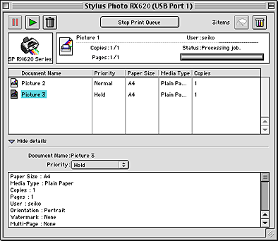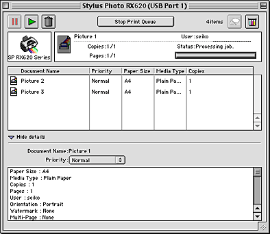 After you send a print job to this product, you can use the EPSON MonitorIV utility to check, cancel, or change the priority of print jobs that are queued for printing. This utility also shows the status of the job currently being printed.