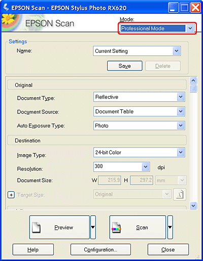Start EPSON Scan and then select the Professional Mode. For details on how to select a scanning mode, see Changing a scanning mode.