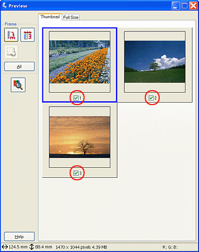 EPSON Scan automatically locates the multiple photos, and then preview them as thumbnail images. Select the number check box of an image you want to scan.
