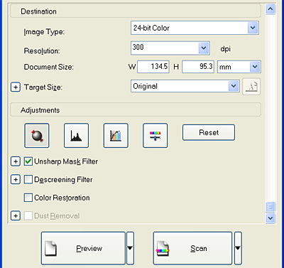When the output size of the scanned image is already decided, select an appropriate setting from the Target Size list. A marquee proportional to the measurements of the Target Size setting appears in the Preview window. You can move this marquee to the area of the image you want to scan. For more details, see the online help.
