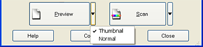 Clicking Preview in the Home Mode or Professional Mode starts prescanning and previews the image. Depending on the scanning mode and the Document Type settings, a small arrow appears to the right of the Preview button allowing you to select a preview method. Click the arrow and select Thumbnail or Normal to change the preview method.