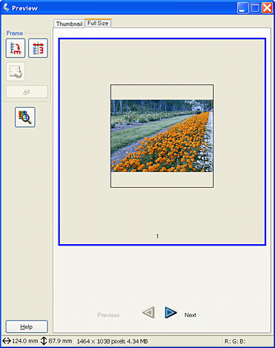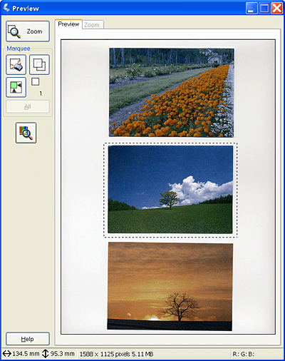 The Normal Preview method allows you to see the entire previewed image and the effects of settings you made, and to make additional image adjustments. You can also use marquees to scan selected portions of an image. For details on marquees, see Using marquees.