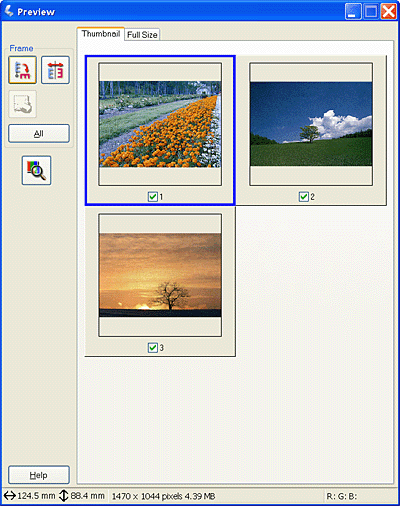 The Thumbnail Preview method allows you to preview multiple images in a thumbnail layout. EPSON Scan automatically locates the target images and applies the Auto Exposure feature to each image. You can modify each thumbnail image and make additional image adjustments. You can also use marquees to scan selected portions of an image. For details on marquees, see Using marquees.