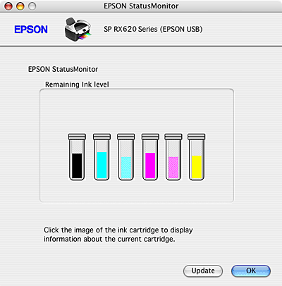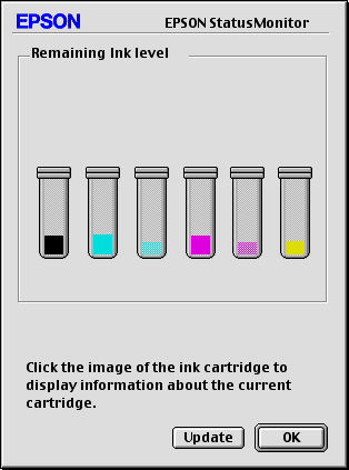 The graphic displays the amount of ink that remained when EPSON StatusMonitor was first opened. To update the ink-level information, click Update.