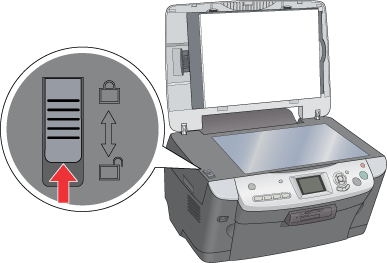 ![]() | Open the document cover and slide the transportation clamp, as shown in the illustration below, to lock the scanner carriage. |