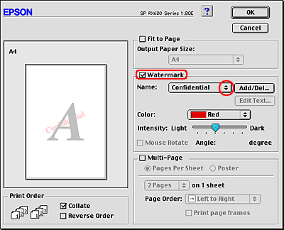 Make sure that the appropriate watermark is selected in the Watermark list, then make Color, Position, Density, Size, Font, Font Style, and Angle settings. For details, see online help. Your settings are reflected in the display at the left side of the dialog box.