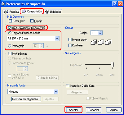 Haga clic en la ficha Composición y seleccione la casilla de verificación Reducir/Ampliar documento.