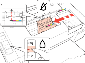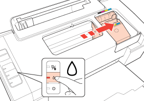 Pulse el botón de la tinta  . El soporte de cartuchos se desplazará a la posición de revisión de los cartuchos de tinta, y el indicador de encendido  empezará a parpadear. El cartucho de tinta señalado con la marca  está vacío o casi vacío.