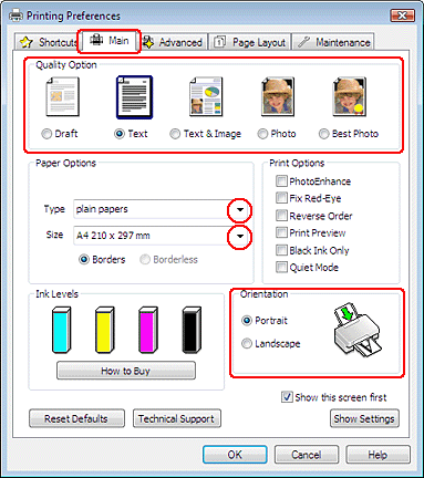 Haga clic en la ficha Main (Principal) y seleccione uno de los siguientes ajustes de Quality Option (Opción de Calidad):
