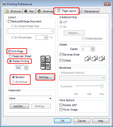 Haga clic en la ficha Page Layout (Composición), seleccione Multi-Page (Multi páginas) y luego Poster Printing (Impresión de Póster). Haga clic en la flecha hacia arriba o hacia abajo para seleccionar 2x1, 2x2, 3x3 ó 4x4.