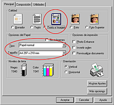 Haga clic en la ficha Principal y seleccione Papel normal y A4 en Opciones del Papel , y Texto e Imagen en Calidad.