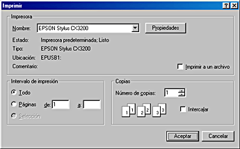 En el cuadro de diálogo que aparece, haga clic en Impresora, Configuración, Opciones o en Propiedades. (Según la aplicación que use, es posible que tenga que hacer clic en una combinación de dichos botones). Aparecerá la ventana del software de la impresora.