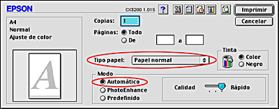 Seleccione Papel normal en Tipo papel, y Automático en Modo.