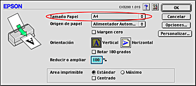 Seleccione A4 en Tamaño Papel. Después, haga clic en OK para cerrar el cuadro de diálogo.