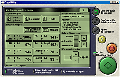 Utilice esta aplicación para transformar este producto en una fotocopiadora digital. La aplicación parece una fotocopiadora de verdad, aunque sus funciones son mucho más potentes y flexibles que las de las fotocopiadoras convencionales. Para más detalles, consulte la documentación de EPSON Smart Panel.