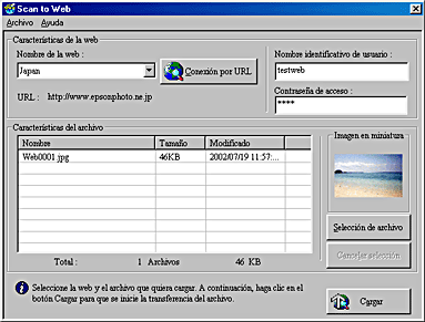 Utilice esta aplicación para escanear una imagen y cargarla en el sitio Web para compartir fotografías de EPSON. Cuando inicie esta aplicación, se escaneará una imagen desde EPSON TWAIN y se mostrará en el cuadro de diálogo Verificar asistente. Haga clic en Finalizar y aparecerá el siguiente cuadro de diálogo. Haga clic en Cargar para cargar la imagen. Para más detalles, consulte la documentación de EPSON Smart Panel.