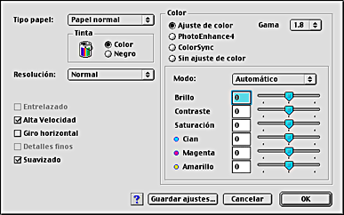Al seleccionar un ajuste predefinido, automáticamente se definen otros ajustes tales como Resolución, Semitonos y Color. Las modificaciones de estos ajustes aparecen en la parte izquierda del cuadro de diálogo Imprimir.
