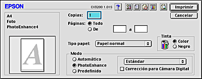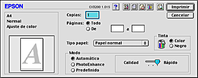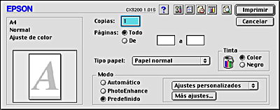 En el cuadro de diálogo Imprimir, puede configurar los ajustes de Tipo papel, Modo, Tinta, Copias y Páginas. Desde este cuadro de diálogo también puede acceder a otros cuadros de diálogo, en los que podrá ajustar el tiempo de impresión, previsualizar el documento antes de imprimirlo y guardar los datos de spool en un archivo. Consulte la sección correspondiente más abajo.