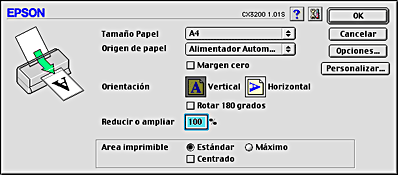 En el cuadro de diálogo Ajustar página, puede modificar el tamaño de papel, especificar su orientación, girar el documento 180 grados, reducir o aumentar la impresión y ajustar el área imprimible.