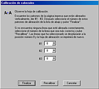 En cada uno de los patrones de la hoja de prueba impresa, elija la línea vertical que esté mejor alineada. En cada patrón, seleccione el número de línea correspondiente en el cuadro de lista desplegable del cuadro de diálogo Alineación de cabezales. Luego, haga clic en Finalizar para activar los nuevos ajustes.