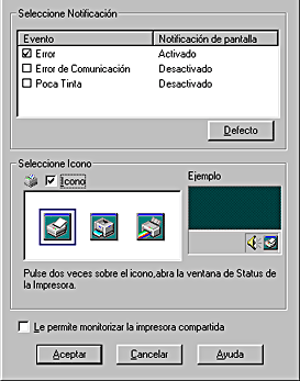 Haga clic en este botón para abrir el cuadro de diálogo Preferencias de Monitorización, que permite ajustar EPSON Status Monitor 3.