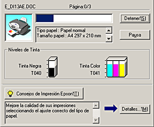 EPSON Spool Manager es parecido al Administrador de impresión de Windows. Si recibe dos o más trabajos de impresión a la vez, los coloca en una cola (con impresoras en red, la llamada cola de impresión) según el orden de llegada. Cuando un trabajo de impresión llega al principio de la cola, EPSON Spool Manager lo envía a la impresora. Puede cancelar trabajos de impresión desde Spool Manager. También puede ver información sobre el estado de la impresión de los trabajos enviados a este producto, así como hacer una pausa o reanudar los trabajos de impresión seleccionados.