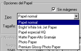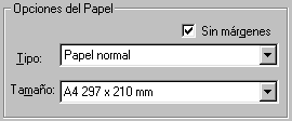 ![]() | En Windows, seleccione el Tipo y el Tamaño deseados en Opciones del Papel, dentro del menú Principal. Además, seleccione la casilla de verificación Sin márgenes. |