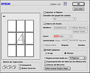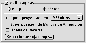 Especifica cuántas hojas de papel impresas va a ocupar la página ampliada del documento. Puede elegir entre 4, 9 y 16 hojas.