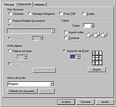 Para ajustar la forma en que va a imprimir el póster, haga clic en el botón Ajustes. Se abrirá el cuadro de diálogo Ajustes del póster.
