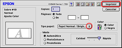 Seleccione Papel normal/Papel blanco brillante como ajuste de Tipo papel y luego configure los ajustes de Color y Modo adecuados. Si desea más detalles, consulte la ayuda on-line.