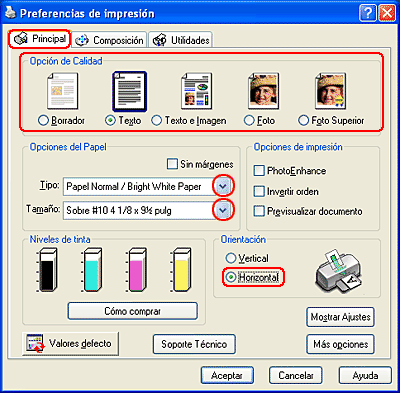 Seleccione el tamaño de sobre adecuado en Tamaño papel.