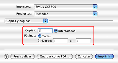 Seleccione Stylus CX3600 como el ajuste de Impresora y defina los ajustes de Copias y páginas.