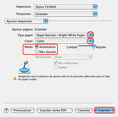 Seleccione Stylus CX3600 como el ajuste de Impresora.