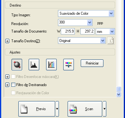 ![]() | Especifique el tamaño de salida de las imágenes escaneadas en Tamaño destino. Si fuera necesario, después configure valores en Ajustes. Si desea más información, consulte Creación de reproducciones bonitas. |