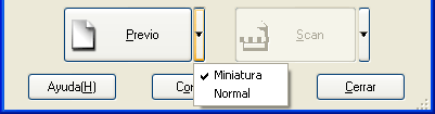 Cuando se hace clic en el botón Previo, comienza el preescaneado y se previsualiza la imagen. Según el modo de escaneado y los ajustes de Tipo documento seleccionados, puede aparecer una flechita a la derecha del botón Previo, la cual le permite seleccionar un método de previsualización. Haga clic en la flecha y seleccione Miniaturas o Normal para cambiar el método de previsualización.