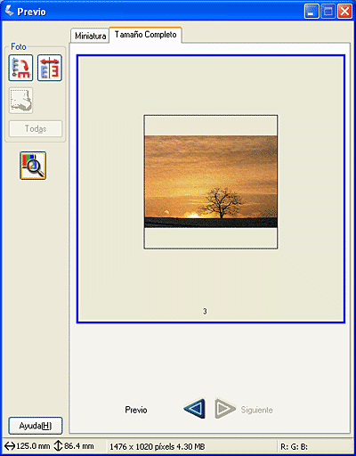 El método de previsualización Normal le permite ver toda la imagen previsualizada y los efectos de los ajustes que configure, así como ajustar todavía más la imagen. También puede utilizar marcos para escanear las partes seleccionadas de una imagen. Para más detalles sobre los marcos, consulte Uso de los marcos.