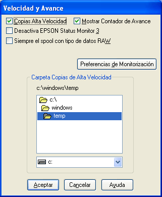 En el cuadro de diálogo Velocidad y avance, los usuarios de Windows pueden definir ciertos ajustes relativos a la velocidad de impresión. Haga clic en el botón Velocidad y avance del menú Utilidades del software de la impresora. Aparecerá el siguiente cuadro de diálogo.