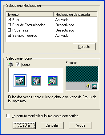 Seleccione la casilla de verificación Icono y elija un tipo de icono si desea colocar un icono de acceso directo en la barra de tareas de Windows. Puede hacer clic en el icono de la barra de tareas para abrir EPSON Status Monitor 3, o hacer clic con el botón secundario en el icono para acceder a algunas utilidades de la impresora. |