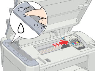Pulse el botón Tinta . El cabezal de impresión se desplazará a la posición de revisión de los cartuchos de tinta, y los indicadores On y Tinta se pondrán intermitentes. El cartucho de tinta señalado con la marca está vacío o casi vacío.