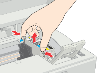 Abra la cubierta del cartucho. Apriete los laterales del cartucho de tinta que desee sustituir. Saque el cartucho de la impresora y deséchelo de forma adecuada. No desmonte ni intente rellenar el cartucho usado.