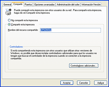 Si desea que Windows XP o 2000 descargue automáticamente los controladores de la impresora para los ordenadores que ejecuten versiones distintas de Windows, haga clic en Controladores adicionales y seleccione el entorno y los sistemas operativos de los otros ordenadores. Haga clic en Aceptar e inserte el CD del software en la unidad de CD-ROM.