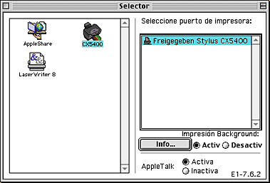 Haga clic en OK. En la lista de puertos del Selector, ahora figura el nombre de la impresora compartida.