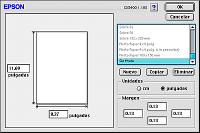 Si desea eliminar un tamaño de papel personal, haga clic en Personalizar, seleccione el tamaño en la lista del cuadro de diálogo Papel personalizado y haga clic en Borrar.