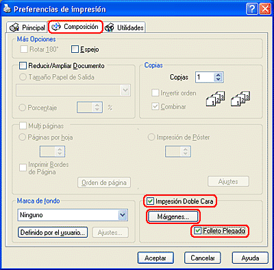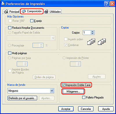 Haga clic en la ficha Composición y seleccione la casilla de verificación Impresión a doble cara.