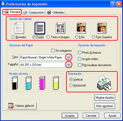![]() | Haga clic en la ficha Principal y luego en el ajuste Calidad. Si desea más detalles, consulte la ayuda on-line. |