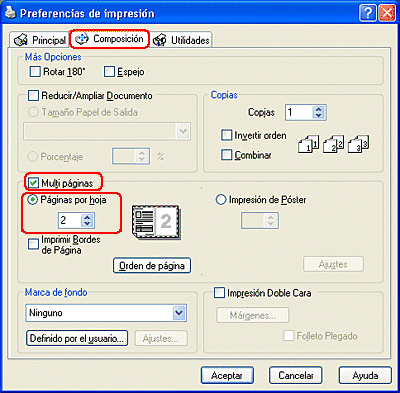 ![]() | Haga clic en la ficha Composición y seleccione la casilla de verificación Multi páginas. Después, seleccione Páginas por hoja. |